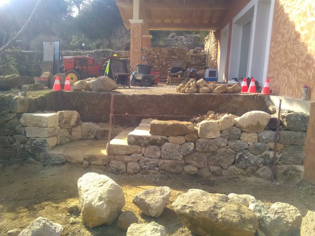 Toujours dans le village de Jouques, nous avons aménagés un espace en pierre sèche, avec un escalier pour pouvoir accéder à la terrasse du bas