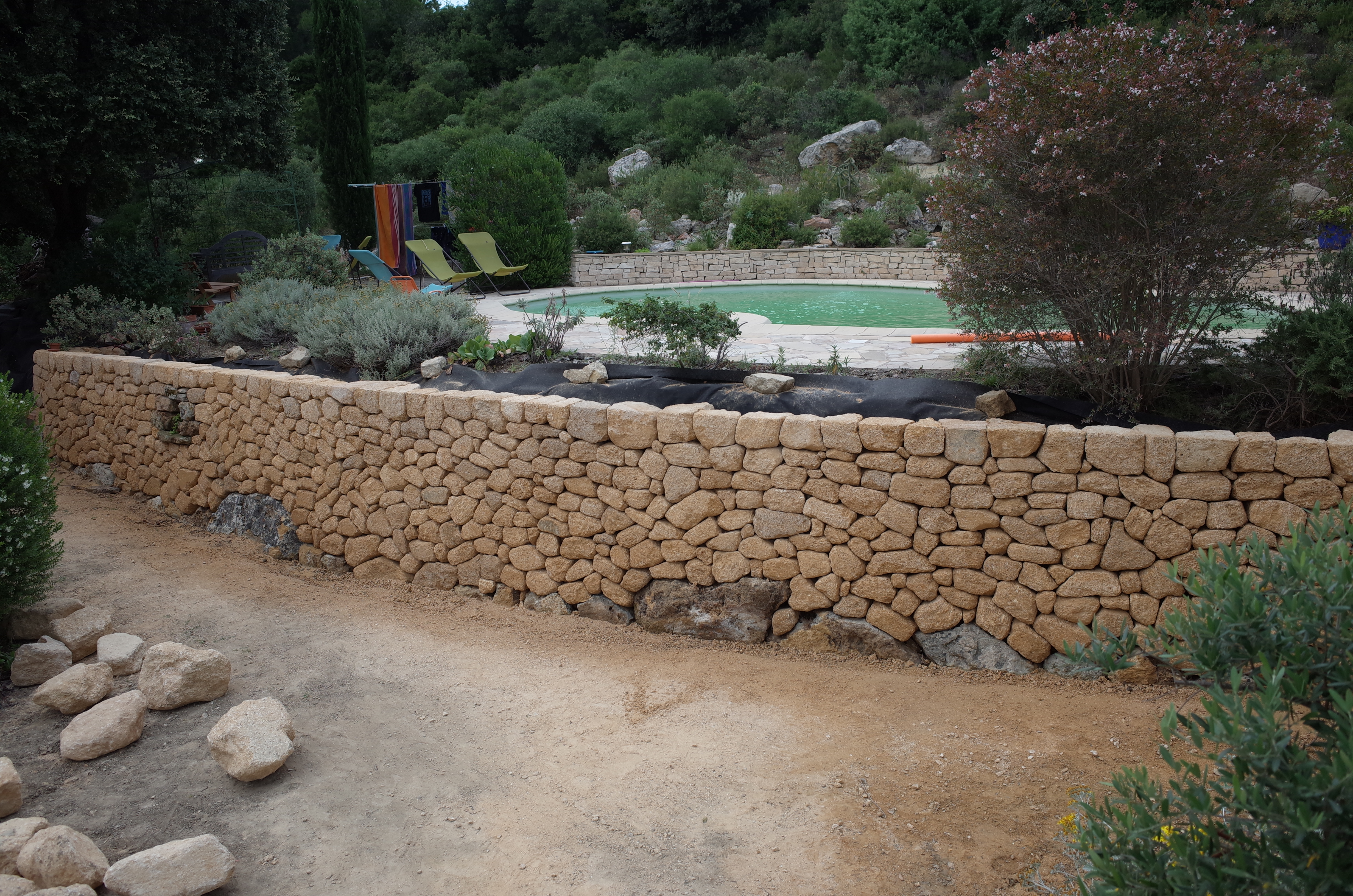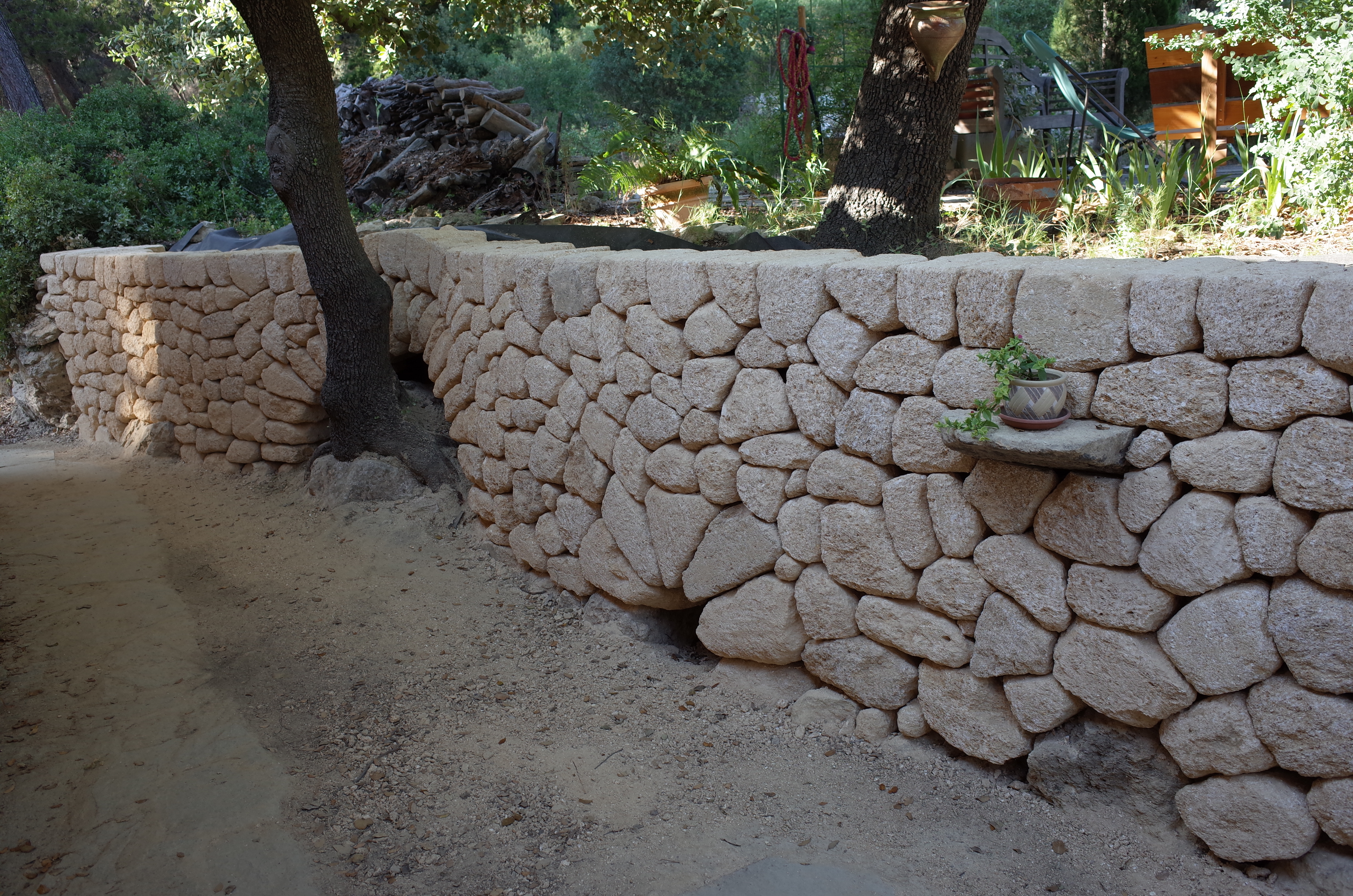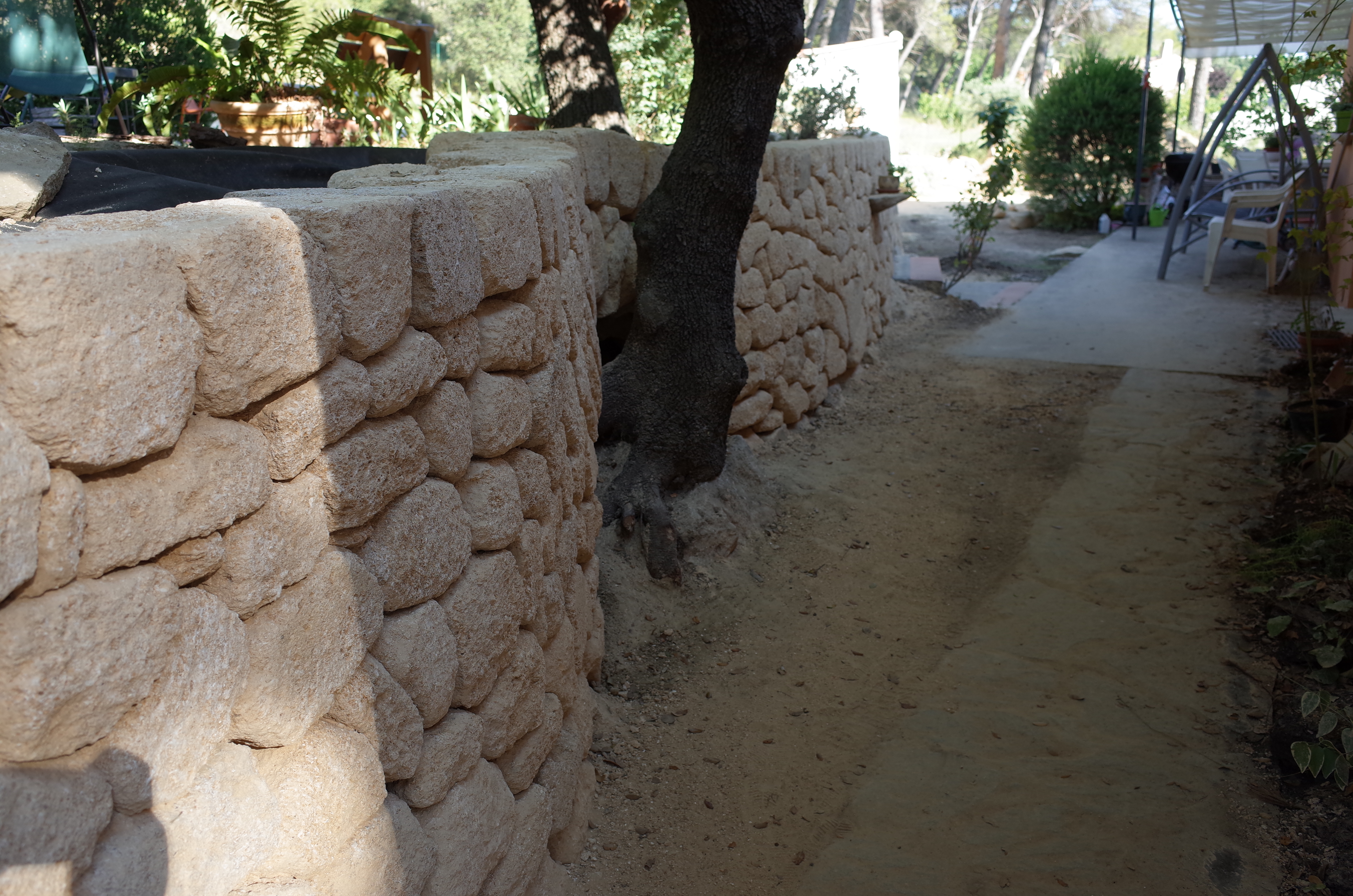voûte pour protéger les racines de l’olivierdeuxième petite voûte et petite tablettedes rondins de bois et de la terre pour servir de gabaritDeuxième mur prés de la piscine ces ouvrages sont réalisés avec de la pierre de Castillon, avec un appareillage en opus incertumune petite niche à trouvé sa place le long de ce murTroisième mur avec un petit escalier pour avoir un accès de l’autre coté de la piscine