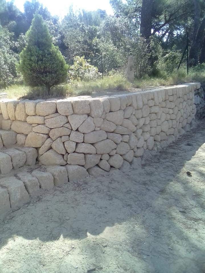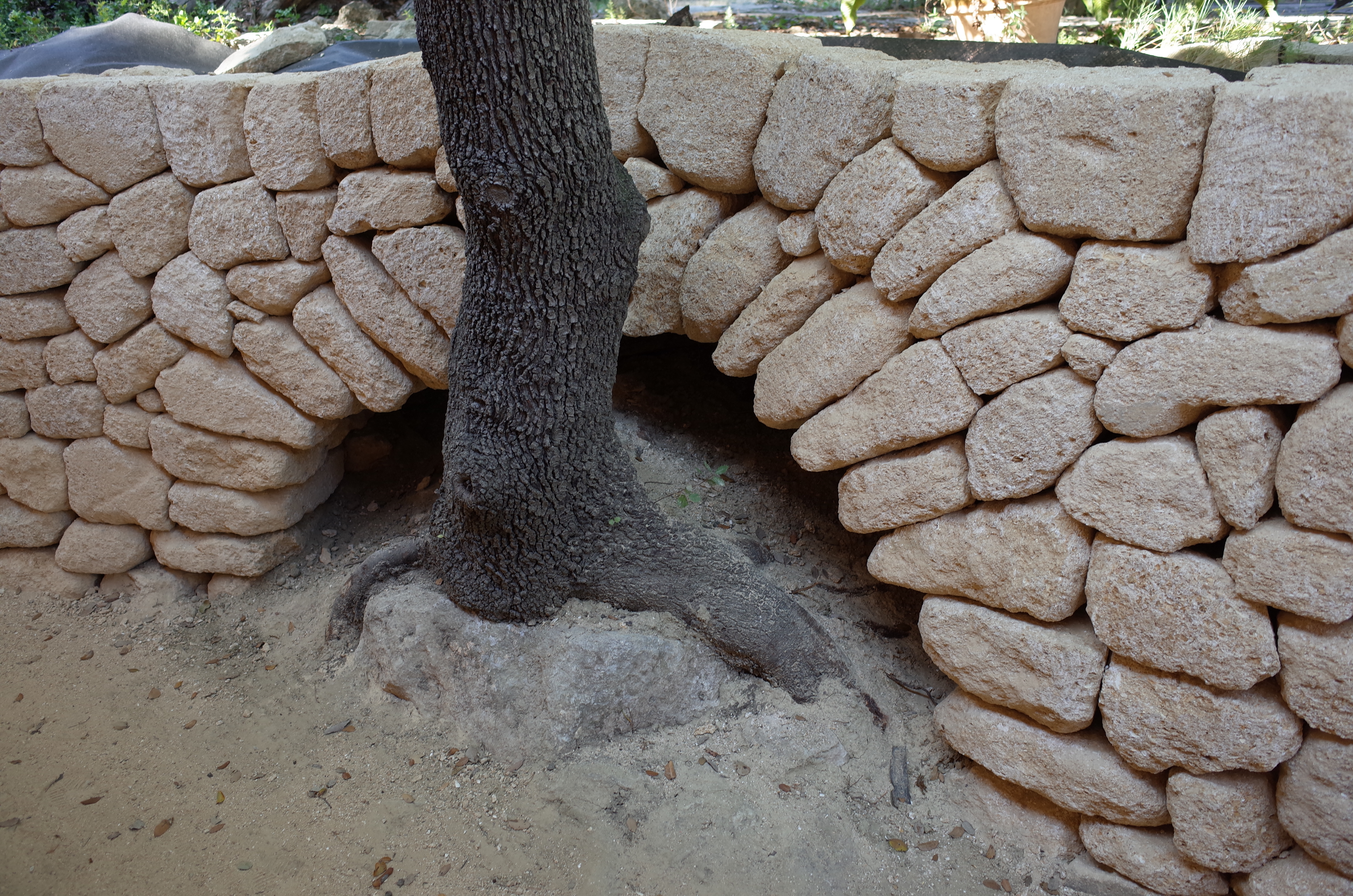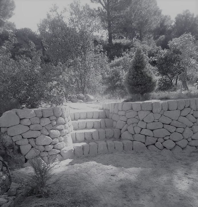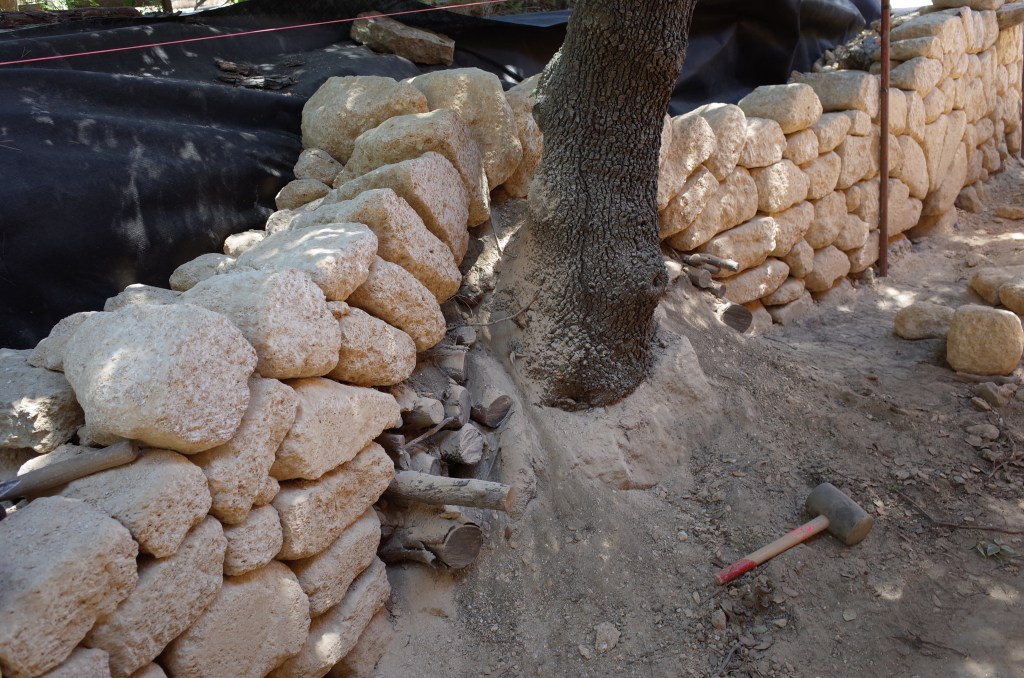 voûte pour protéger les racines de l’olivierdeuxième petite voûte et petite tablettedes rondins de bois et de la terre pour servir de gabaritDeuxième mur prés de la piscine ces ouvrages sont réalisés avec de la pierre de Castillon, avec un appareillage en opus incertumune petite niche à trouvé sa place le long de ce murTroisième mur avec un petit escalier pour avoir un accès de l’autre coté de la piscine