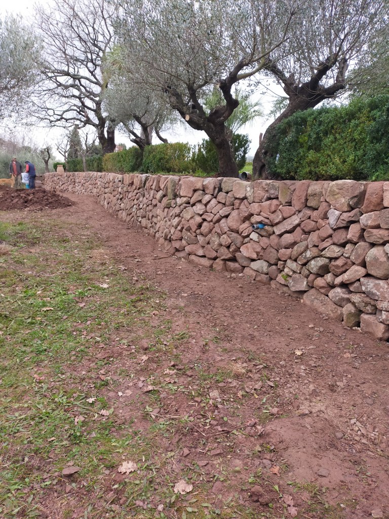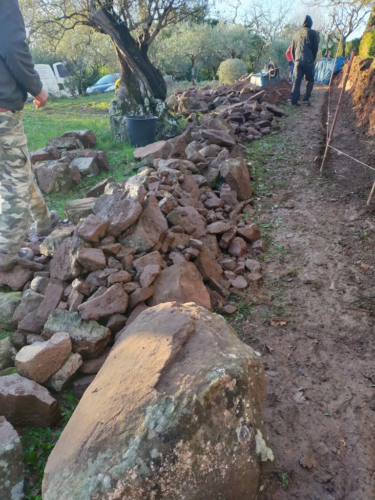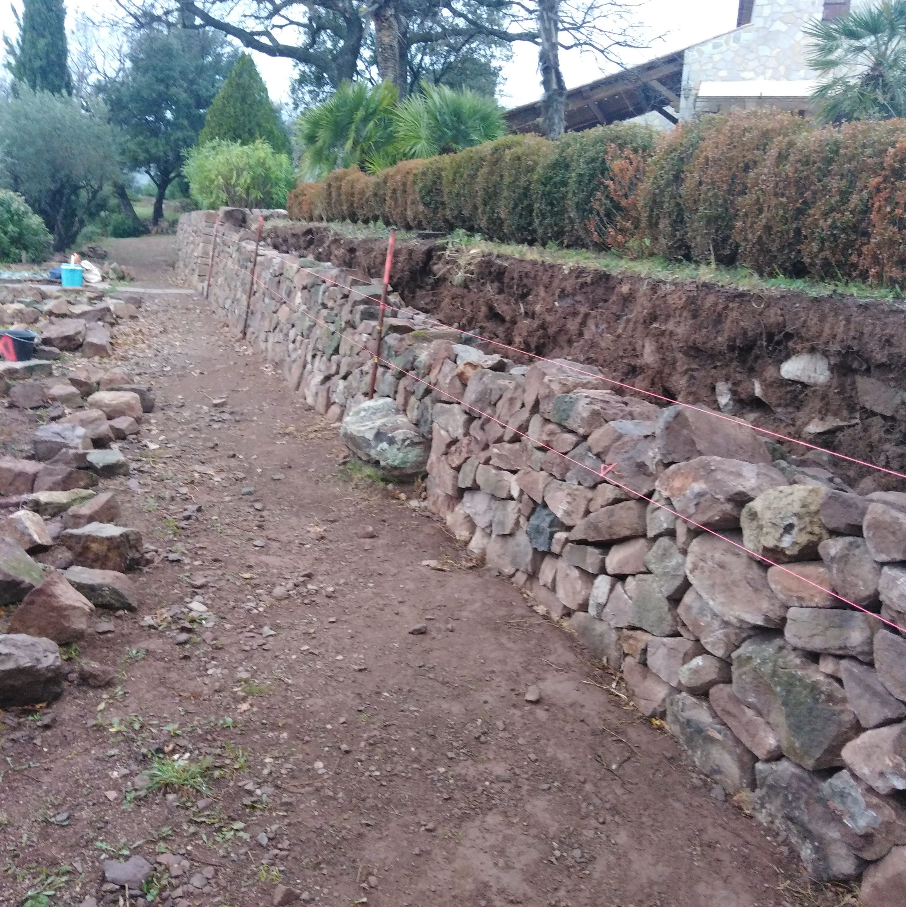 fouille et montage du mur. La fin du premier mur se termine en fuseau, le couronnement est clavé